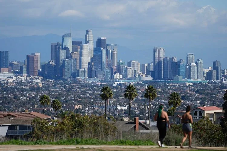 Những đám mây bão bao phủ đường chân trời Los Angeles khi nhìn từ Khu Giải trí Tiểu bang Kenneth Hahn sau một cơn mưa bão ở Los Angeles, hôm 17/01/2023.