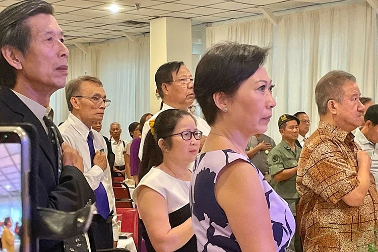 Quan khách thân hữu và gia đình Cựu Tù Nhân Chính Trị Ái Tử - Bình Điền chào cờ