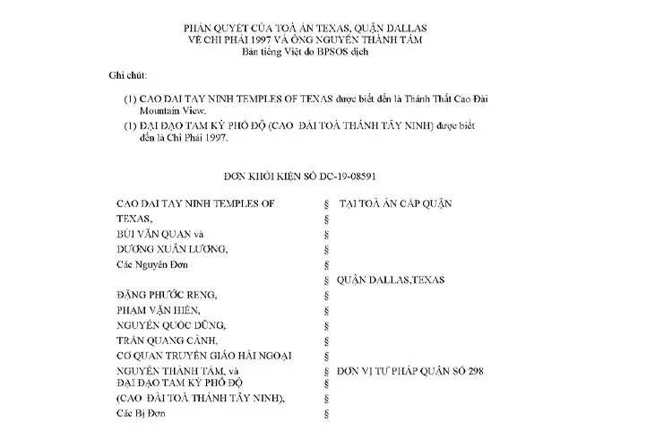 Theo yêu cầu của nhiều tín đồ Cao Đài ở trong và ngoài Việt Nam, chúng tôi cung cấp bản dịch tiếng Việt phán quyết của Toà Án Texas Quận Dallas ngày 16/08/2023. Toà án phán quyết rằng Chi Phái Cao Đài do nhà nước Việt Nam dựng lên năm 1997 và thủ lĩnh của nó là Ông Nguyễn Thành Tám cấu thành tổ chức tội phạm chiếu theo luật RICO, tức luật chống băng đảng mafia, của Hoa Kỳ. Theo phán quyến, 2 bị đơn này phải trả tổng cộng 200.000 USD tiền bồi thường cho các nguyên đơn cộng với tiền lãi 6% mỗi năm. Toà cũng phán quyết rằng nếu bị đơn kháng cáo và thua thì phải trả luật sư phí cho nguyên đơn.