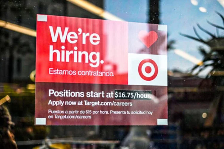 Một biển quảng cáo tuyển nhân viên mới với mức lương khởi điểm cập nhật là 16.75 USD mỗi giờ trong cửa sổ của một cửa hàng Target ở Hollywood, California, hôm 09/11/2021. (Ảnh: ROBYN BECK/AFP qua Getty Images)