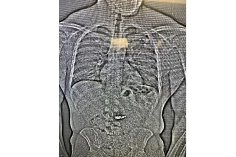 Phim X-quang cho thấy vật thể lạ trong hệ tiêu hóa của Gilder. Ảnh: AP