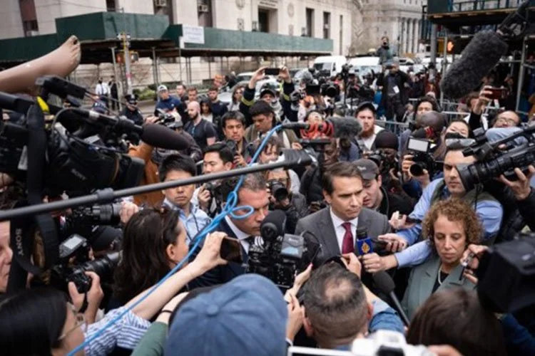 Nhân viên truyền thông bên ngoài Tòa án Tối cao Quận New York trước phiên tòa buộc tội cựu Tổng thống Donald Trump, hôm 04/04/2023. (Ảnh: Chung I Ho/The Epoch Times)