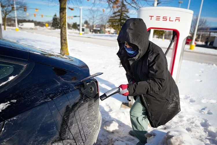 Một người phụ nữ chuẩn bị sạc điện cho chiếc xe Tesla của mình ở Ann Arbor, Michigan, hôm 17/01/2024. Một đợt rét đột ngột trên khắp Hoa Kỳ và Canada đã bộc lộ những mặt bất lợi lớn đối với những người sở hữu xe điện. (Ảnh: AP/Carlos Osorio)