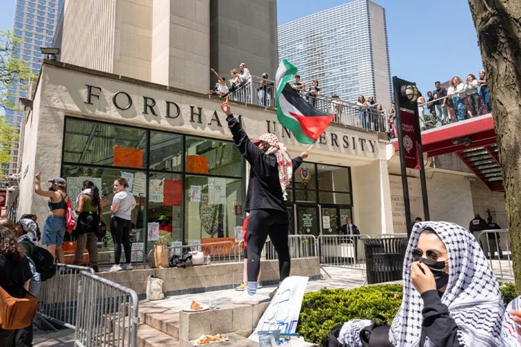 Những người biểu tình ủng hộ Palestine tụ tập bên ngoài khuôn viên Trung tâm Lincoln của Fordham sau khi một nhóm dựng trại bên trong tòa nhà này ở thành phố New York, hôm 01/05/2024. (Ảnh: Spencer Platt/Getty Images)