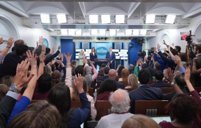 Bộ trưởng Tài chính Mỹ Scott Bessent (phải) tại cuộc họp báo ở Nhà Trắng ngày 15-4Ảnh: AP