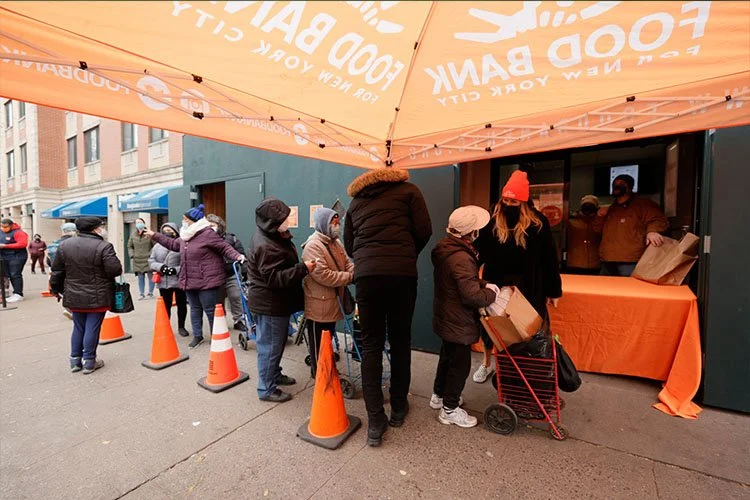 Dân chúng xếp hàng nhận thực phẩm tại trụ sở Food Bank For New York City và One Warm Coat ngày 10 Tháng Mười Hai. (Hình: Michael Loccisano/Getty Images for Food Bank For New York City)