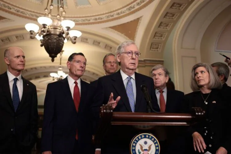 Lãnh đạo Thiểu số Thượng viện Mitch McConnell (Cộng Hòa-Kentucky) nói trước các phóng viên sau bữa tiệc trưa chính sách hàng tuần của Đảng Cộng Hòa, từ trái sang phải: Thượng nghị sĩ Rick Scott (Cộng Hòa-Florida), Thượng nghị sĩ John Barrasso (Cộng Hòa-Wyoming), Thượng nghị sĩ John Thune (Cộng Hòa-South Dakota), Thượng nghị sĩ Roy Blunt (Cộng Hòa-Missouri), và Thượng nghị sĩ Joni Ernst (Cộng Hòa-Iowa) có mặt tại Quốc hội Hoa Kỳ ở Hoa Thịnh Đốn hôm 05/10/2021. (Ảnh: Anna Moneymaker/Getty Images)