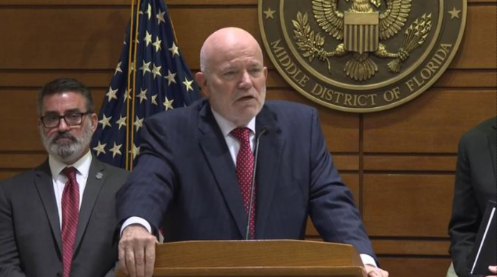 Công tố viên liên bang Gregory W. Kehoe nói về 11 người bị truy tố vì gian lận hôn nhân liên quan đến công dân Trung Cộng và quân nhân Mỹ. Ảnh: ABC News