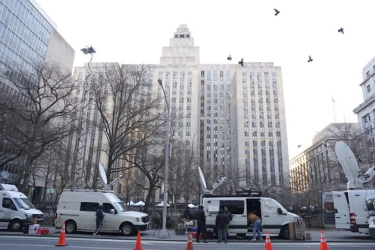 Nhân viên truyền thông bên ngoài Tòa án Tối cao Quận New York trước phiên tòa buộc tội cựu Tổng thống Donald Trump hôm 04/04/2023. (Ảnh: Samira Bouaou/The Epoch Times)
