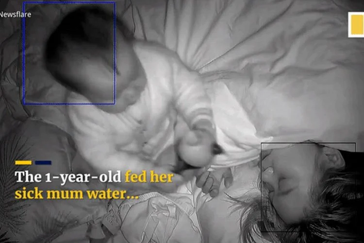 Trong video do camera trong nhà ghi lại, em bé ở tỉnh Phúc Kiến, Trung Hoa có hành động đưa bình nước vào miệng cho mẹ uống và kéo chăn cho mẹ.