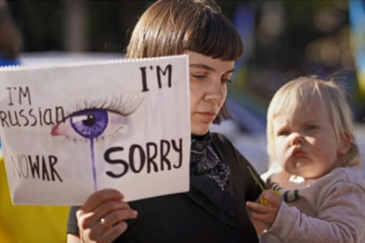 Một người phụ nữ Nga cầm tấm biển có nội dung : "Tôi là người Nga, hãy ngừng chiến tranh, tôi xin lỗi" để bày tỏ sự ủng hộ của cô đối với Ukraina tại Santa Monica, California, Hoa Kỳ ngày 27/02/2022. AP - Damian Dovarganes