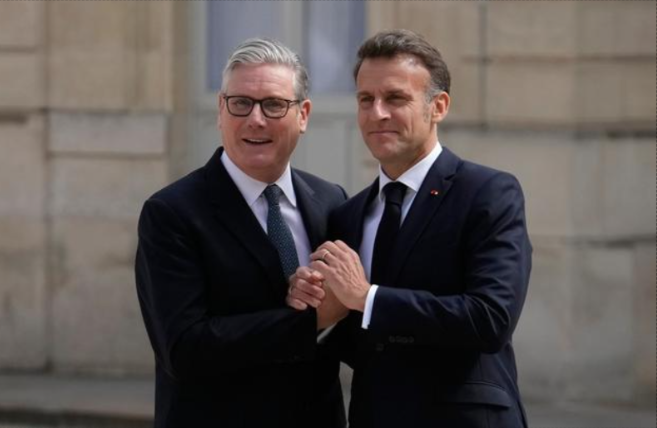 Tổng thống Pháp Emmanuel Macron (phải) bắt tay với Thủ tướng Anh Keir Starmer trước thềm hội nghị nhằm thúc đẩy nỗ lực mở lại eo biển Hormuz tại Điện Elysee, Paris ngày 17.4.2026
