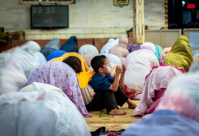 Bé trai sử dụng điện thoại tại một nhà thờ ở Indonesia (Ảnh: Guardian).