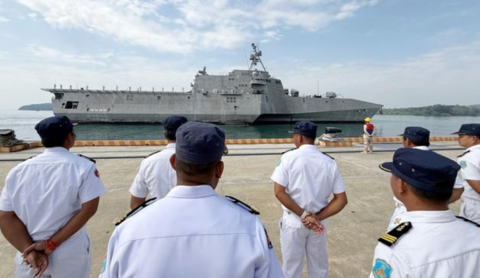 Ngày 24.1, tàu tác chiến cận bờ USS Cincinnati (LCS-20) của Hải quân Mỹ đã bắt đầu neo tại cầu cảng của căn cứ hải quân Ream, tỉnh Preah Sihanouk, miền nam Campuchia, theo AFP. Cách đó chỉ khoảng 150 m là 2 tàu chiến của Trung Cộng.