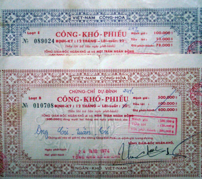 Công khố phiếu (giờ gọi là công trái) phát hành ngày 24-10-1974. Nguồn: Internet
